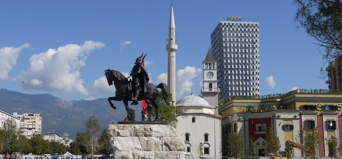 Der Skanderbeg-Platz wurde 1968 erbaut und nach dem albanischen Nationalhelden benannt. Skanderbeg war ein Adliger aus dem 15. Jahrhundert, bekannt für seinen Widerstand gegen die Osmanen und eine Hauptfigur im albanischen nationalen Widerstand. Der Platz liegt im Herzen von Stadt und Politik. Während der Monarchie gab es in seiner Nähe mehrere Institutionen. Zur Zeit des Kommunismus wurden viele der damals umliegenden Gebäude zerstört, und der Platz erfuhr in den 50 Jahren Diktatur große Veränderung. So wurde in seiner Mitte ein Brunnen angelegt. Eine Statue Josef Stalins wurde aufgestellt, auch die größte Statue Enver Hoxhas befand sich hier, zwischen Nationalmuseum und Nationalbank. Während der Demonstrationen gegen das System von 1991 riss die Studentenbewegung die Statue Hoxhas nieder und zog sie die Kavaja-Straße entlang. Heute überragt die Skulptur des albanischen Nationalhelden Skanderbeg die Platzmitte. Dessen Geburtsname lautete Gjergj Kastrioti, und er lebte von 1405 bis 1468. Noch heute ist er in ganz Albanien präsent. Neben der Statue weht in Purpurrot mit einem schwarzen Doppelkopfadler die albanische Flagge, die Flagge Skanderbegs. Sie wurde 1912 von albanischen Patrioten bei der Unabhängigkeitserklärung gehisst und fand später auch bei Enver Hoxha Gebrauch, allerdings ergänzt um den gelben Kommunistenstern. Skanderberg und seine Flagge symbolisieren die Einigung zwischen Süd- und Nordalbanien. Er vereinte alle Stämme und Führer seiner Zeit mit dem Ziel, den mächtigen Feind, den türkischen Sultan und seine Armeen, zu besiegen. Über mehr als 20 Jahre bot Skanderbeg dem osmanischen Sultan die Stirn. Zentrum seines Widerstands war die Burg von Kruja.